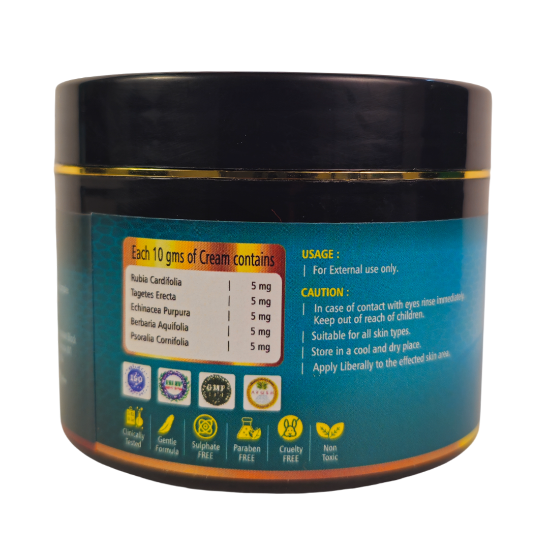 Psoralea corylifolia (Bakuchi - 5 mg): It works on lines and wrinkles, pigmentation, elasticity and firmness, and photodamage and is hence called nature's retinol. It also gives long-lasting relief from psoriasis/eczema.